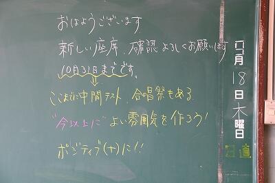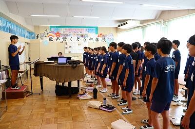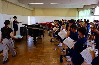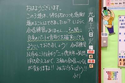 昨日の5校時、3年生が学年合唱の練習をするというのでワクワクして体育館に足を運びました。10月の合唱祭の学年合唱曲である「春に」の練習をしていました。学年で集まっての練習は初めてということで、“まだ荒いのだろうな…”と思っていました。確かに荒い、でもそれ以上に強く思ったのは、“すごいなこの学年”ということ。何がすごいと感じたのか…、2つあります。1つは、3年の先生方全員が合唱指導にあたっていたということ。3年生の先生方は3年生の生徒たちのために日々様々なことに労を惜しまず取り組んでくれています(もちろん1、2年生の先生方もそうです)。最上級生である3年生には特に、生徒たちの手で素晴らしい合唱に仕上げることで、いつまでも記憶に残る貴重な経験をさせたいと思っていることが校長先生には伝わってきました。2つ目は、3年生の生徒たちの姿!日頃の音楽の授業で学んだこと、過去の先輩方の勇姿に憧れたこと、そして自分たちが築いてきた学校生活、それらすべてを合唱に乗せて歌い上げるという強い気持ちが伝わってくる取り組みでした。合唱部の歌とは違う“合唱祭”の“学年合唱”らしい力強さを感じました。まだ荒い面もありますが、あと1カ月後にはさらに素晴らしい合唱に仕上がっていることでしょう。1、2年生の生徒諸君も3年生を見習い、クラス合唱や学年合唱をがんばってくださいね。