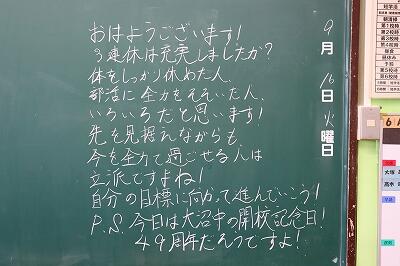 今日は大沼中学校の49回目の開校記念日です。開校記念日は、単に学校ができた日をお祝いする日ではありません。この学校を愛し、守り、発展させてきた多くの人たちの思いを胸に刻み、感謝する日です。