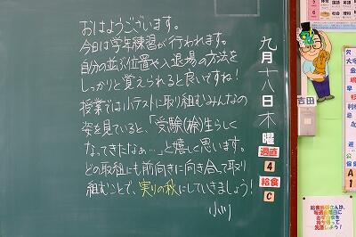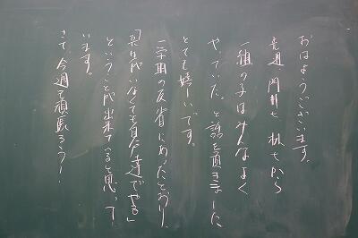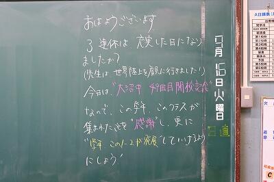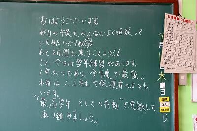 今日から新人戦集中日が始まります。自分がチームの一員として、何ができるのかを考えなさい。一人一人が自分の得意な分野で力を発揮することが何よりも大切です。試合に出る者は試合に出られない者の分まで自分のポジションを精一杯努めること。試合に出られない者は、悔しい気持ちに整理をつけ、チームの勝利という夢を選手に託して応援することでチームを支えよう。これは補欠道というものでとても大事な経験だ。生徒、保護者、教員の総力が一番大きかったチームが優勝するのです。新人戦で君たちの青春をしっかり見届けたいと思います。がんばれ大沼中!(校長)