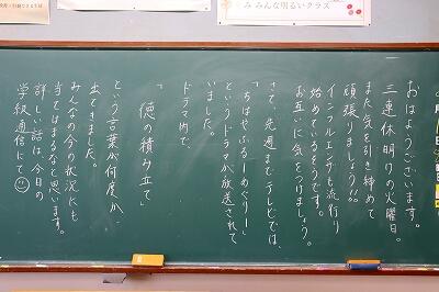 敬老の日はそんなおじいさん、おばあさんのこれまでに対して感謝を伝える日なのです。では、みなさんはその感謝をどのように伝えますか…。「いつもありがとう」と恥ずかしがらずに声に出して言えますか…?校長先生もそうでしたが、中学生の君たちにとってはなかなか恥ずかしくて勇気のいる行動ですよね。言葉にできなくても、手紙を書くとか、肩を叩いてあげるとか、お手伝いをしてあげたりすることも感謝の気持ちを表す立派な行いです。校長先生からのおすすめは、おじいさんやおばあさんの話をニコニコと笑顔で聴いてあげることです。今日をきっかけにおじいさんやおばあさんとたくさんお話をしてください。これからも元気でいてくれるように心を込めてね。(校長)