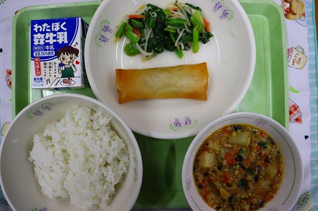 6月30日(月)中華風ピリ辛ごはん、牛乳、変わり春巻き、華風和え、春雨スープ