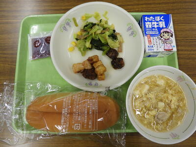 二色揚げパン、牛乳、鶏肉のトマト煮、ワンタンスープでした。