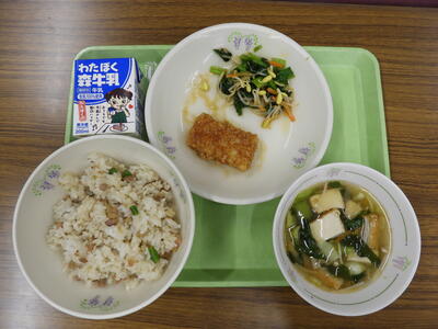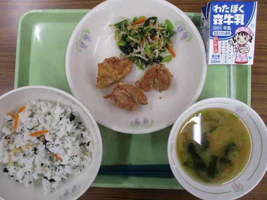 わかめごはん、牛乳、鶏肉のから揚げ、ごま酢和え、みそ汁でした。