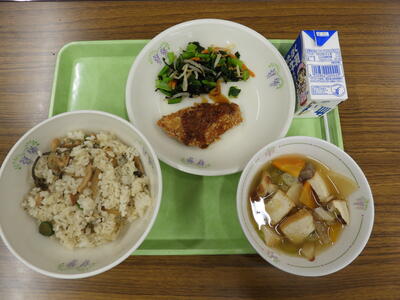 かてめし、牛乳、あじフライ、磯香和え、のっぺい汁でした。