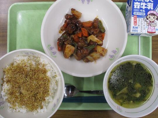 ごはん、手作りふりかけ、牛乳、酢豚、わかめスープでした。