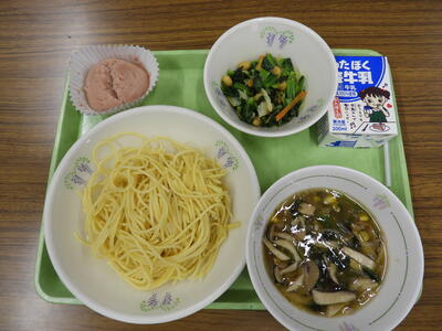 バターロール、スパゲッティ、みそクリームソース、牛乳、大豆とひじきのサラダでした。