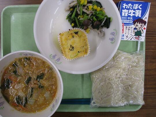 みそキムチラーメン(中華めん、汁)、牛乳、中華風卵焼き小松菜とコーンの炒め物でした。