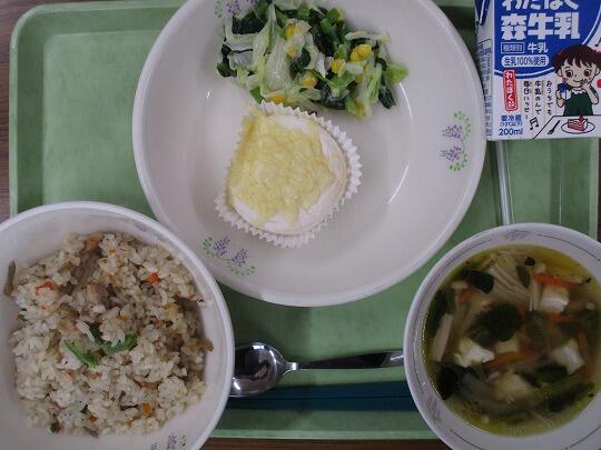 鶏ごぼうピラフ、牛乳、チーズオムレツ、コーンサラダ、コンソメスープでした。