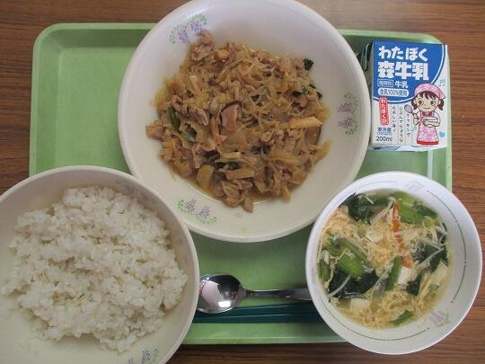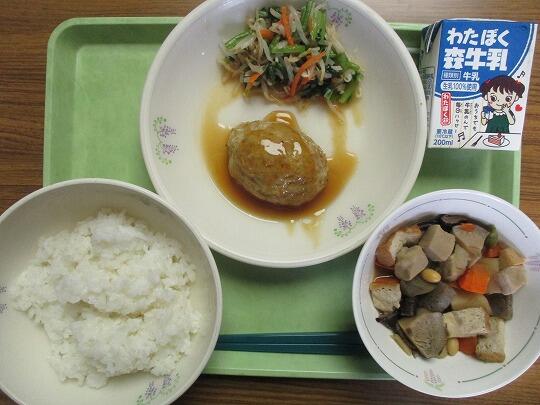 ごはん、牛乳、肉巻き(ポテト、いんげん)、小松菜とキャベツの炒め物、五目煮でした。