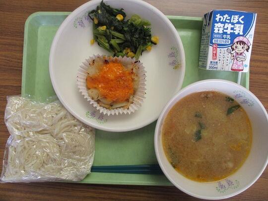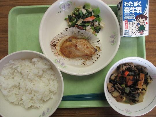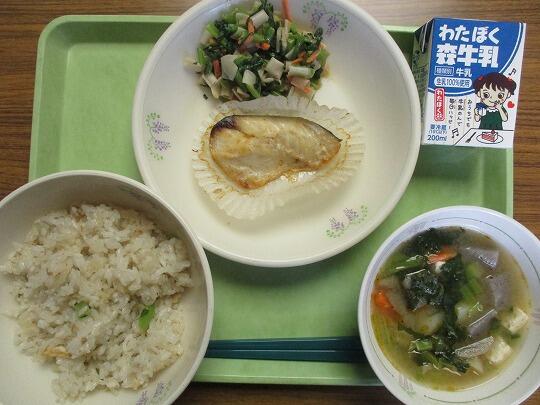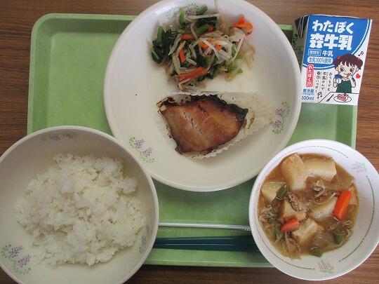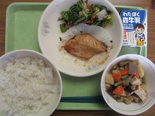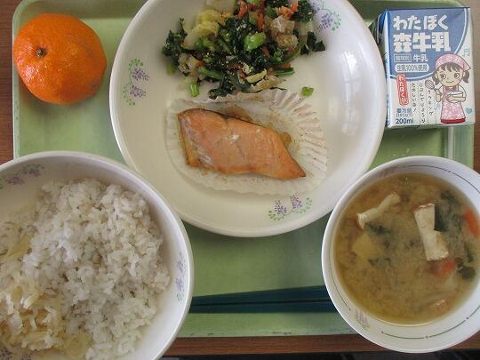 麦ごはん、たくあん、牛乳、鮭の塩焼き、ごま和え、みそけんちん汁、みかんでした。