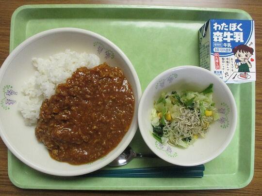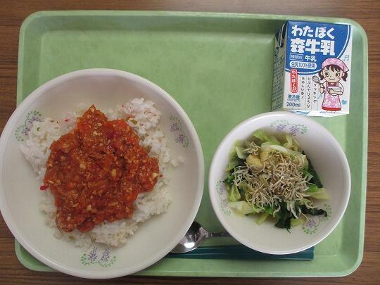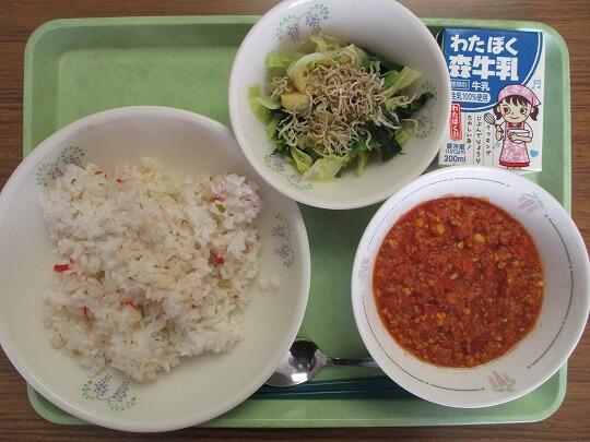 メキシコ風ピラフ(ごはん、ソース)、牛乳、青菜とじゃこのサラダでした。