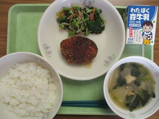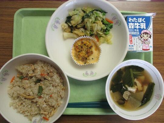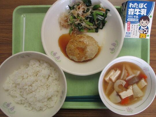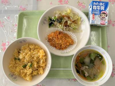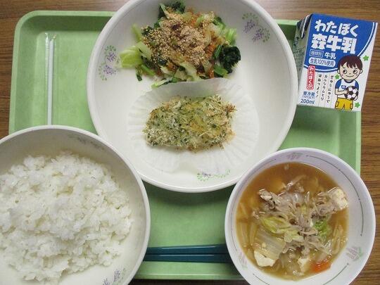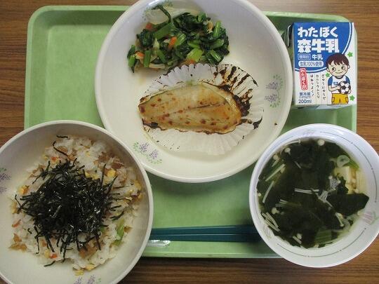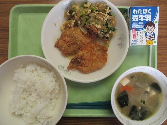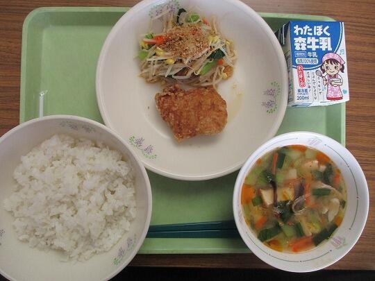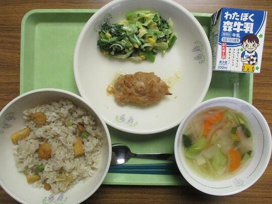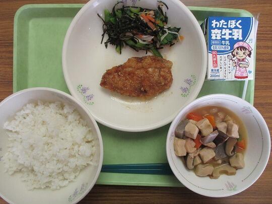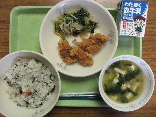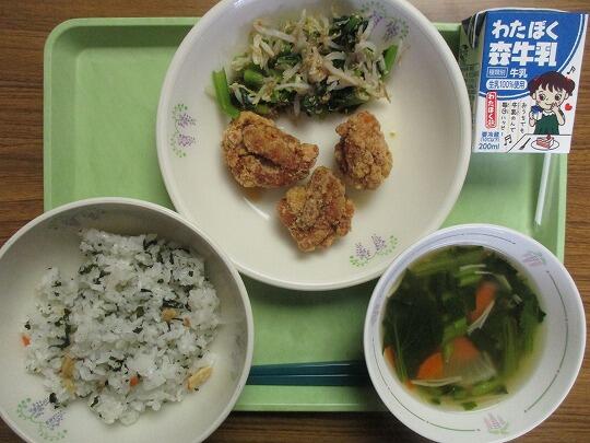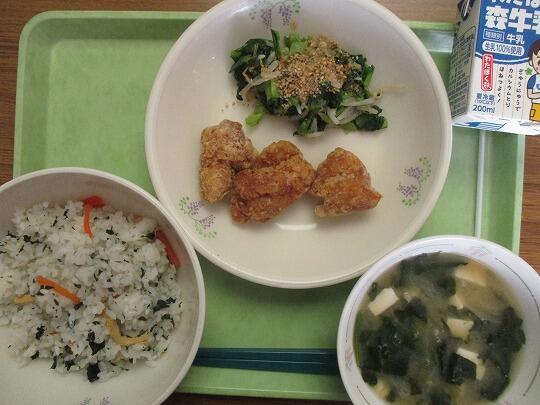 わかめごはん、牛乳、鶏肉のから揚げ、ごま酢和え、みそ汁でした。