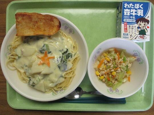 シュガーフランス、スパゲッティ、こまつなクリーム、牛乳、チキンサラダでした。