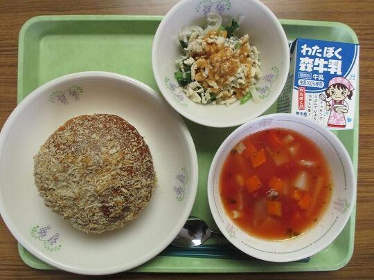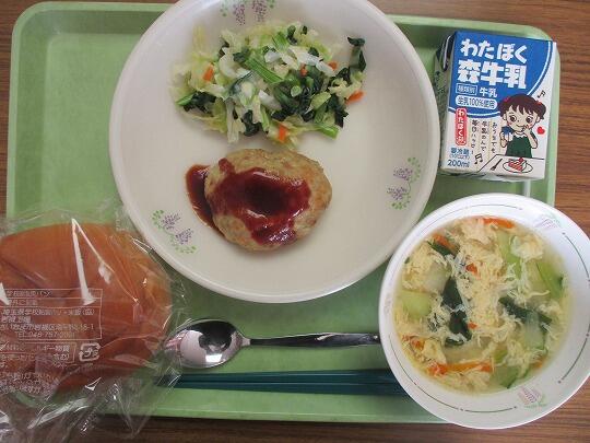 子どもパン、牛乳、ハンバーグ、コールスローサラダ、洋風かきたまスープでした。