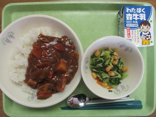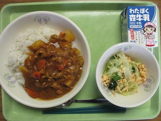 カレーライス(麦ごはん、ルウ)、牛乳、バンバンジーサラダ、くだもの(いちご)でした。