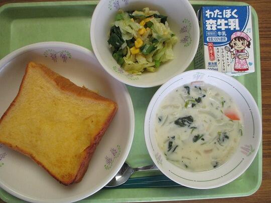 フレンチトースト、牛乳、コーンサラダ、クラムチャウダーでした。