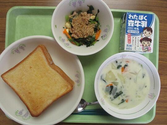 シュガートースト、牛乳、ビーンズサラダ、米粉のクラムチャウダーでした。