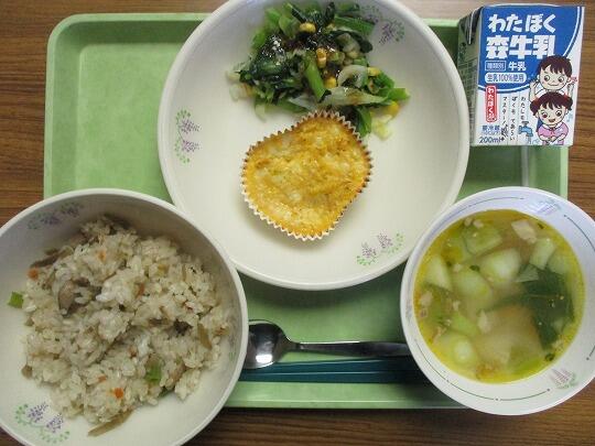 秋の香りごはん、牛乳、ささみのレモン煮、磯香和え、みそけんちん汁でした。