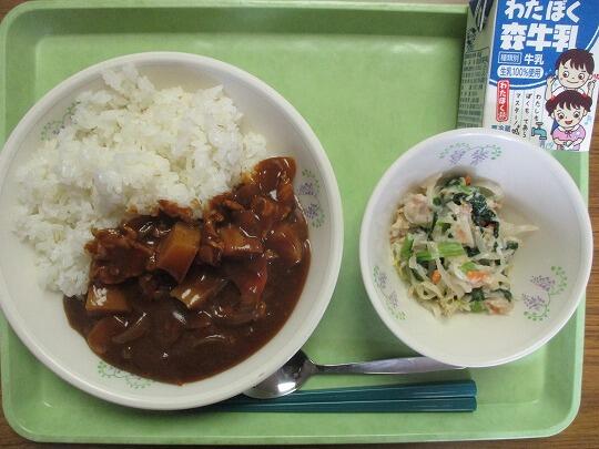 カレーライス(麦ごはん、ルウ)、牛乳、鉄骨サラダでした。