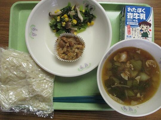 広東麺(中華麺、汁)、牛乳、中華風卵焼き、小松菜のソテーの予定でしたが、