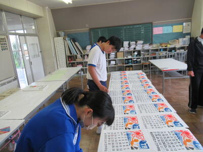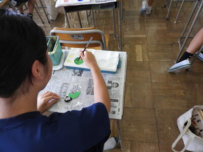 美術の授業では、自分の開きたいお店を漢字1文字で表現する学習をしていました。