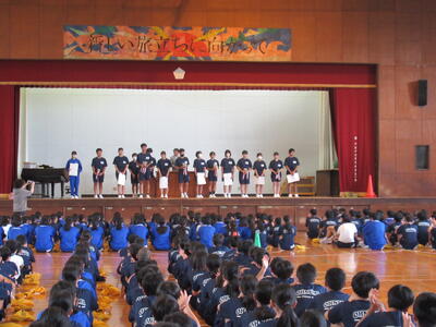 各部活動の部長さんが、オンラインで、決意の言葉を述べてくれました。みな、ノー原稿で立派に決意を述べていました。大会のない部活動も目標をしっかり表明しました。