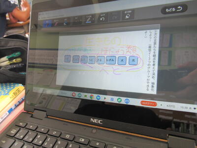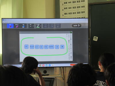 国語の授業で、タブレットを用いて、身近にある事物から「具体と抽象」を学びました。