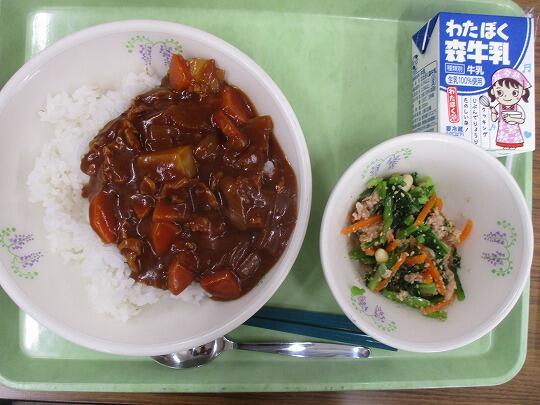 カレーライス(麦ごはん、ルウ)、牛乳、鉄骨サラダでした。