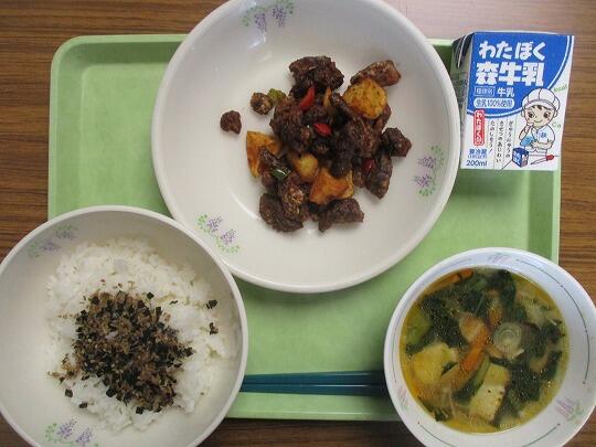 ごはん、手作り大豆ふりかけ、牛乳、酢豚、わかめスープでした。