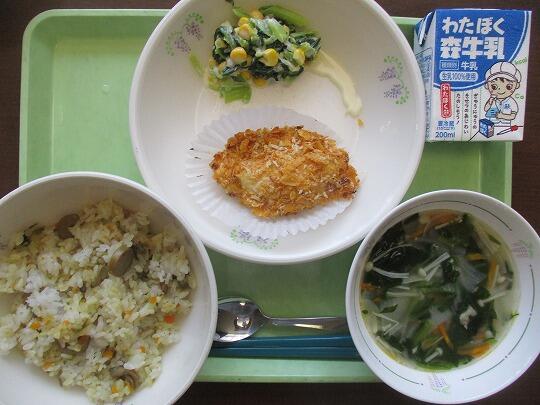 たけのこごはん、牛乳、鶏肉のから揚げ、ごま酢和え、みそ汁でした。