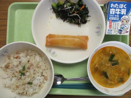 ごはん、牛乳、県産しゃくし菜春巻き、華風和え、マーボー豆腐でした。