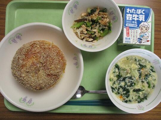 ごはん、牛乳、キャベツ入りメンチカツ、おひたし、みそけんちん汁でした。