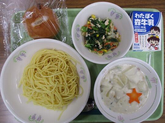 春日部米粉パン、牛乳、スパゲティ、クリームソース、チキンサラダでした。