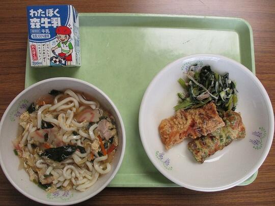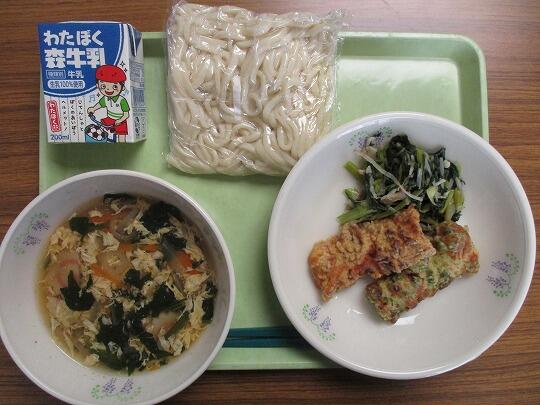かき玉うどん、(地粉うどん、汁)、牛乳、