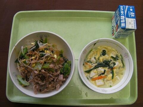 ビビンバ、牛乳、ピリ辛みそ汁です。