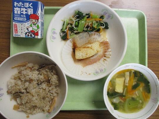 こぎつねごはん、牛乳、あじフライ、磯香和え、みそけんちん汁でした。