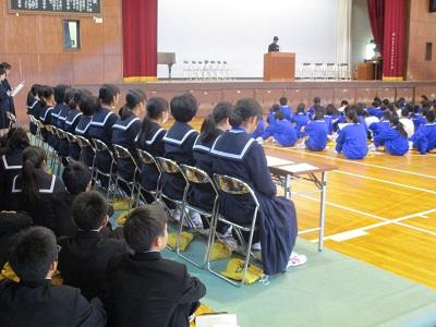 大沼中へ期待します。写真は、新生徒会長のあいさつ