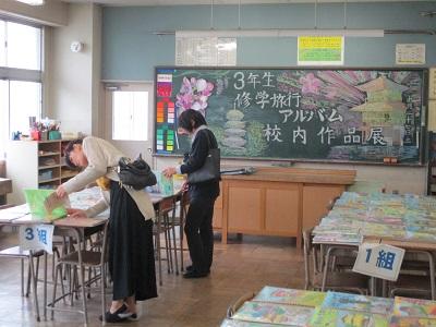 見ていただくために美術室で修学旅行アルバムの展示をはじめ校内