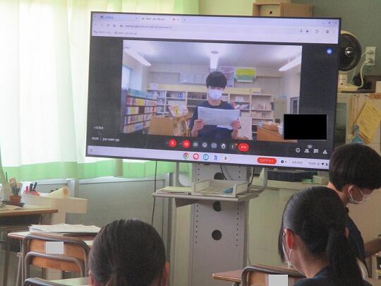 生徒会本部役員、各専門委員会の委員長、各部活動の部長と質問者が図書室に集まり、各クラスのメンバーはにリモートで参加する形で行いました。
