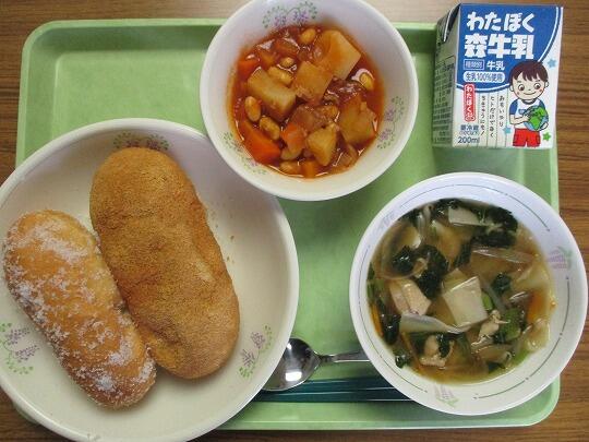 二色揚げパン(きな粉、シュガー)、牛乳、ポークビーンズ、ワンタンスープでした。