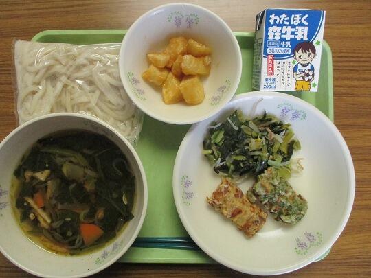煮ぼうとう風うどん(地粉うどん、汁)、牛乳、竹輪の二色揚げ、小松菜のソテー、みそポテトでした。