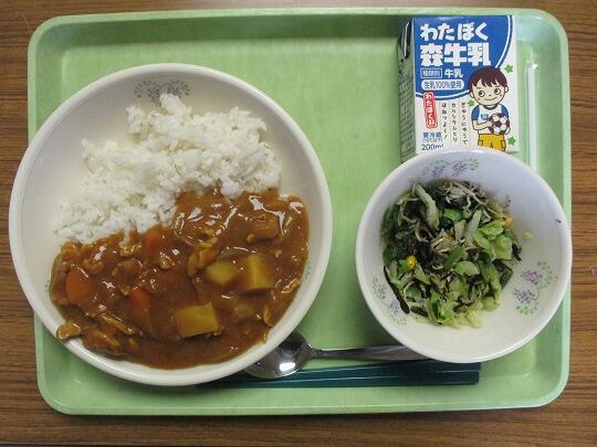 カレーライス(麦ごはん、ルウ)、牛乳、鉄骨サラダでした。