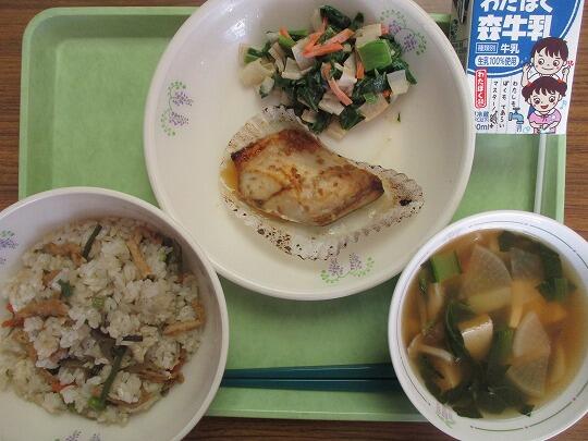 秋の香りごはん、牛乳、ささみのレモン煮、磯香和え、みそけんちん汁でした。