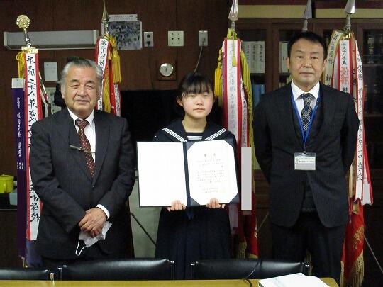 2年生は「帰り道、コンビニの前に倒れていた老人を助け、近くの人に警察と救急車を呼んでもらいました。優しさと判断力に感謝します」という推薦理由で「優しさと判断力に感謝で賞」を受賞しました。