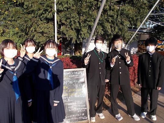 演奏前から、木枯らし1号かと思われるような強風が吹き、譜面台が倒れたり、楽譜を入れたファイルが飛ばされたり、寒さで手がかじかんだりする悪条件の中での演奏でした。演奏中も足で譜面台が倒れないようにするなど工夫しましたが、楽譜がめくれたるなどのハプニングが起こる中でしたが、みごとに、マーチ「春風」と、Little Glee Monsterの「世界はあなたに笑いかけている」の2曲を演奏しきりました。