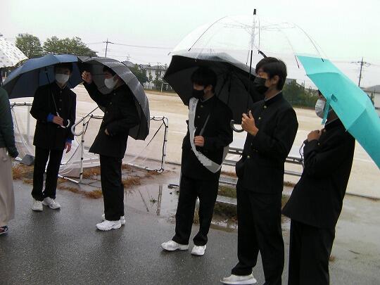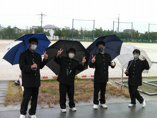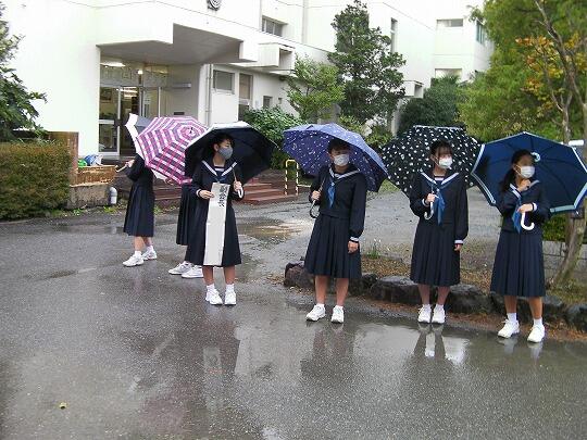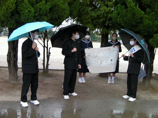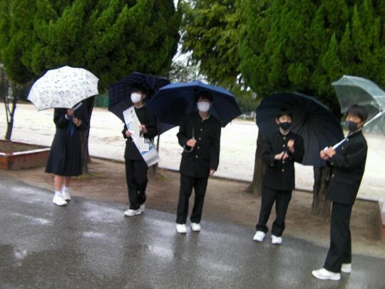 雨にも関わらず、生徒会本部役員立候補者と応援者が朝の活動を頑張っていました。