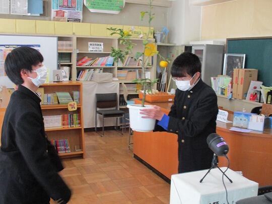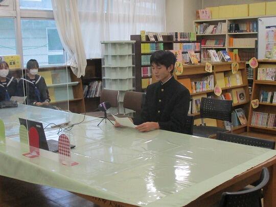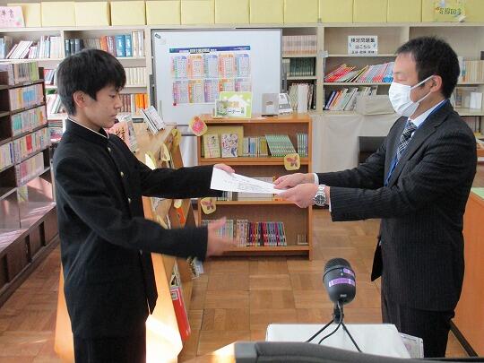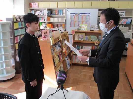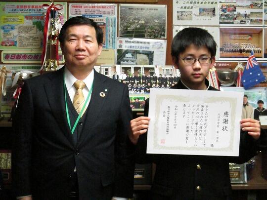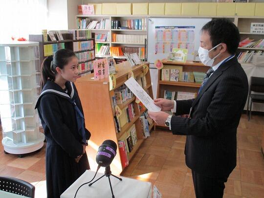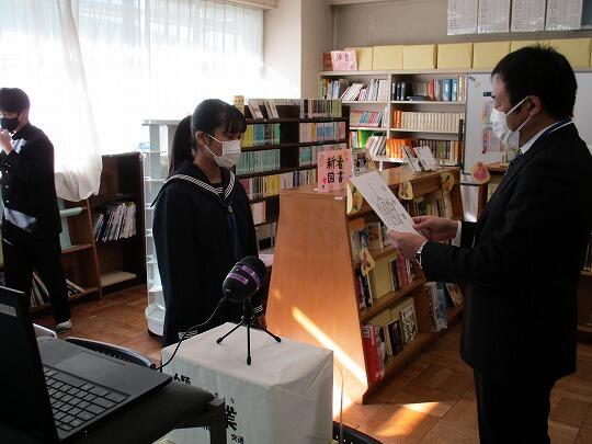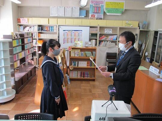 10月14日(木)に春日部市民文化会館で行われた市民アカデミーで本校1年生の人権作文が優秀作品に選ばれ、朗読した映像を披露しました。本来なら、その会場で感謝状を贈呈されていたのですが、新型コロナウイルス感染症感染防止対策で贈呈されなかったので、教育長が本校を訪問して感謝状を贈呈して下さりました。