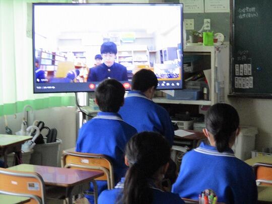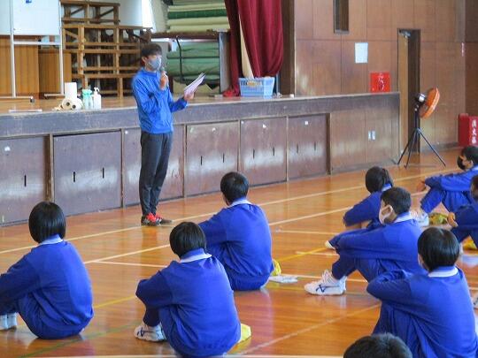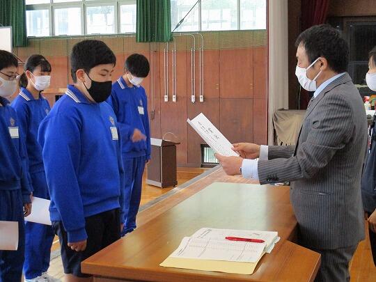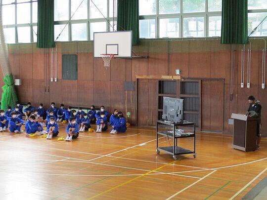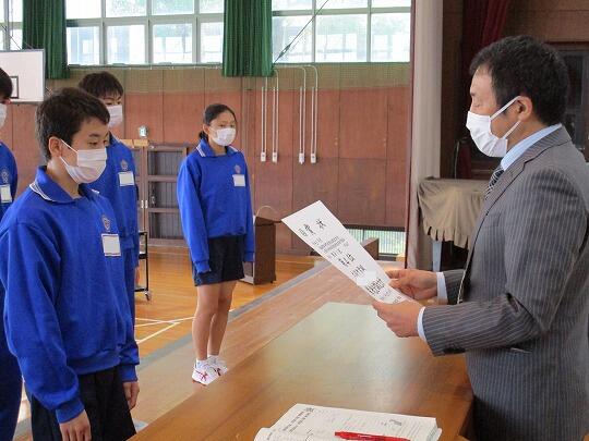 本日、表彰朝会を行いました。体育館で表彰をしている様子をリモートで各教室に映像を送る形で行いました。