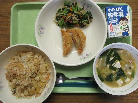 ピース入りわかめごはん、牛乳、鶏肉のから揚げ、ごま酢和え、みそ汁でした。