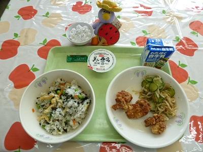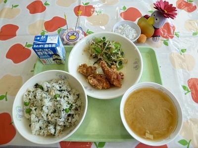 年に1度、旬の生グリンピースが入ったわかめご飯でした。